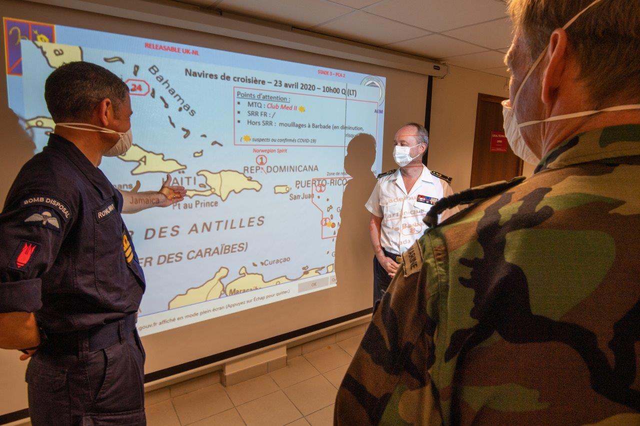 La France, les Pays-Bas et la Grande-Bretagne ont décidé d’unir leurs forces dans les Caraïbes afin de soutenir les populations et les autorités civiles dans la lutte contre la propagation du Covid-19. Depuis le mois d’avril, une cellule militaire de coordination internationale (MI2C : military initiative coordination cell) a été mise en place et opère depuis Fort-de-France (Martinique, Antilles). Elle a pour mission d’optimiser les contributions militaires de chaque nation, dont les navires français PHA Dixmude, britannique RFA Argus et néerlandais HMNLS Karel Doorman...